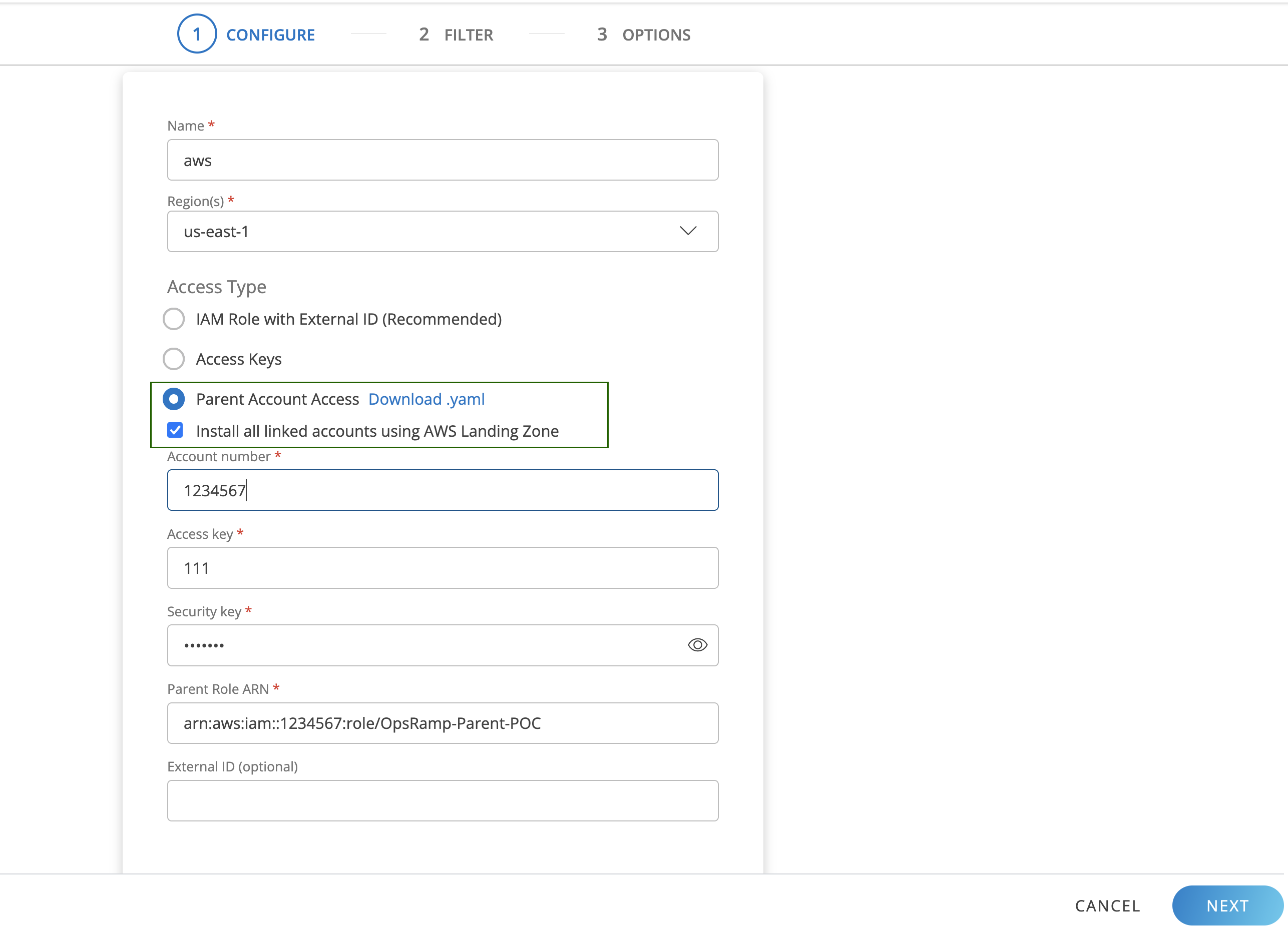 - In OpsRamp, provide the following credentials from the parent (master) account: