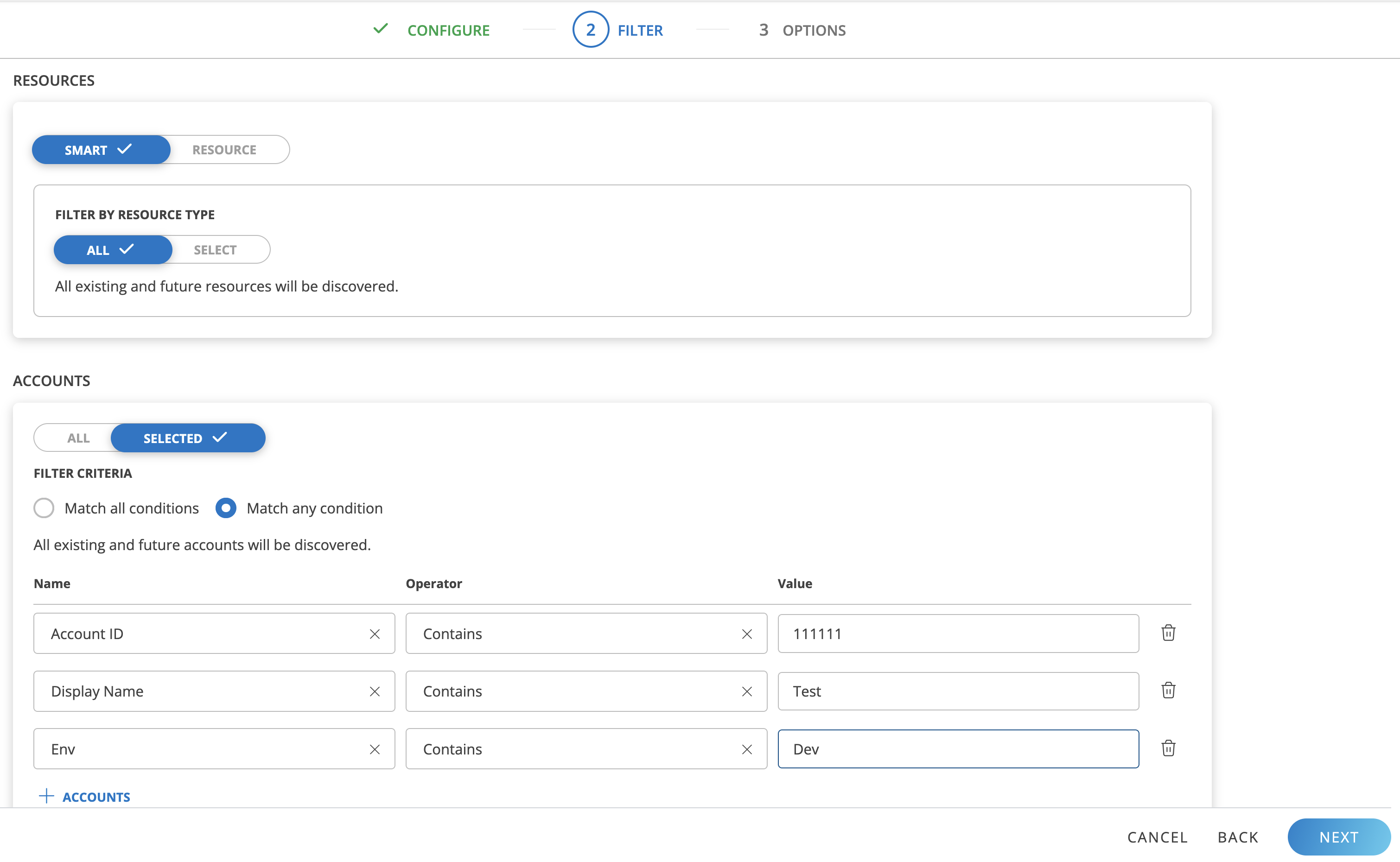 During parent account installation or a parent account rescan, only the child accounts that match the configured filter policy are installed in OpsRamp. The account filter can be updated at any time, followed by a rescan to apply the changes.