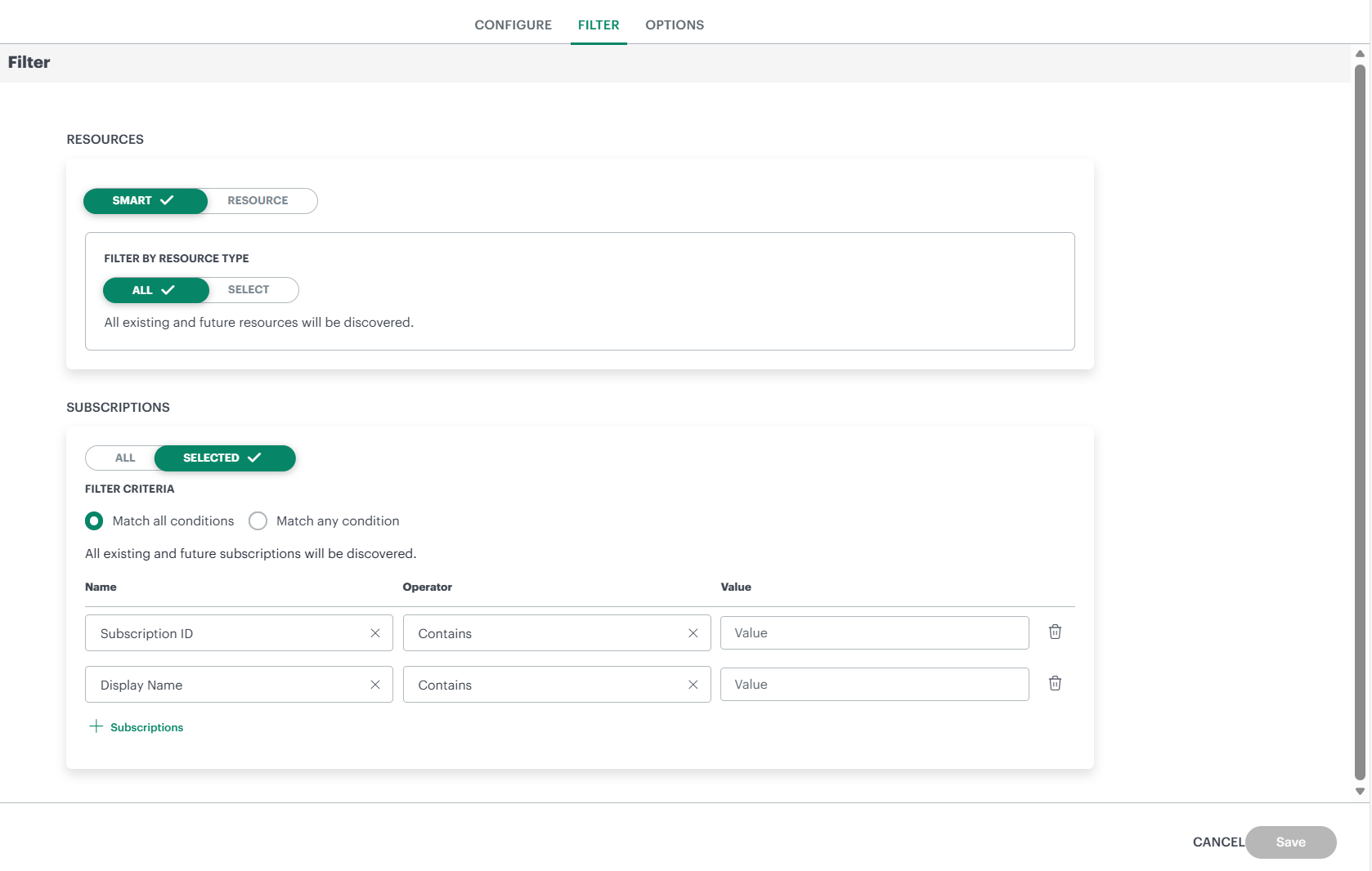 During Azure tenant installation or a tenant rescan, only the subscriptions that match the configured filter policy are installed or updated in OpsRamp. The subscription filter can be modified at any time, followed by a rescan to apply the changes.