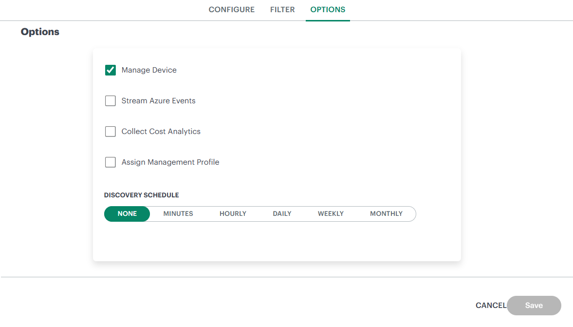 - When you install Azure Tenant Integration, all subscriptions under the tenant will be integrated into the client. During the installation, all child integrations will inherit the properties of the Azure Tenant Integration, including the Discovery profile, Actions (limited to Manage Device), Discovery Schedule, and Credentials. After installation, you can update the Discovery profile, Actions, Credentials, and Discovery Schedule individually as needed.