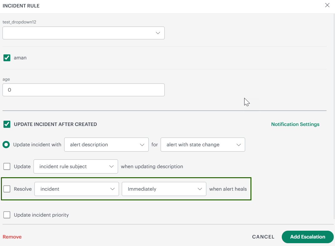 Using this option in the Alert Escalation Policy, incident tickets will be resolved only after the configured duration elapses, even if the heal alert occurs earlier.