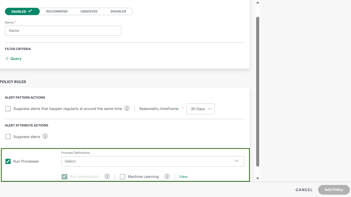 Users can now automatically trigger process automation jobs immediately when alerts are suppressed as part of the First Response Policy.